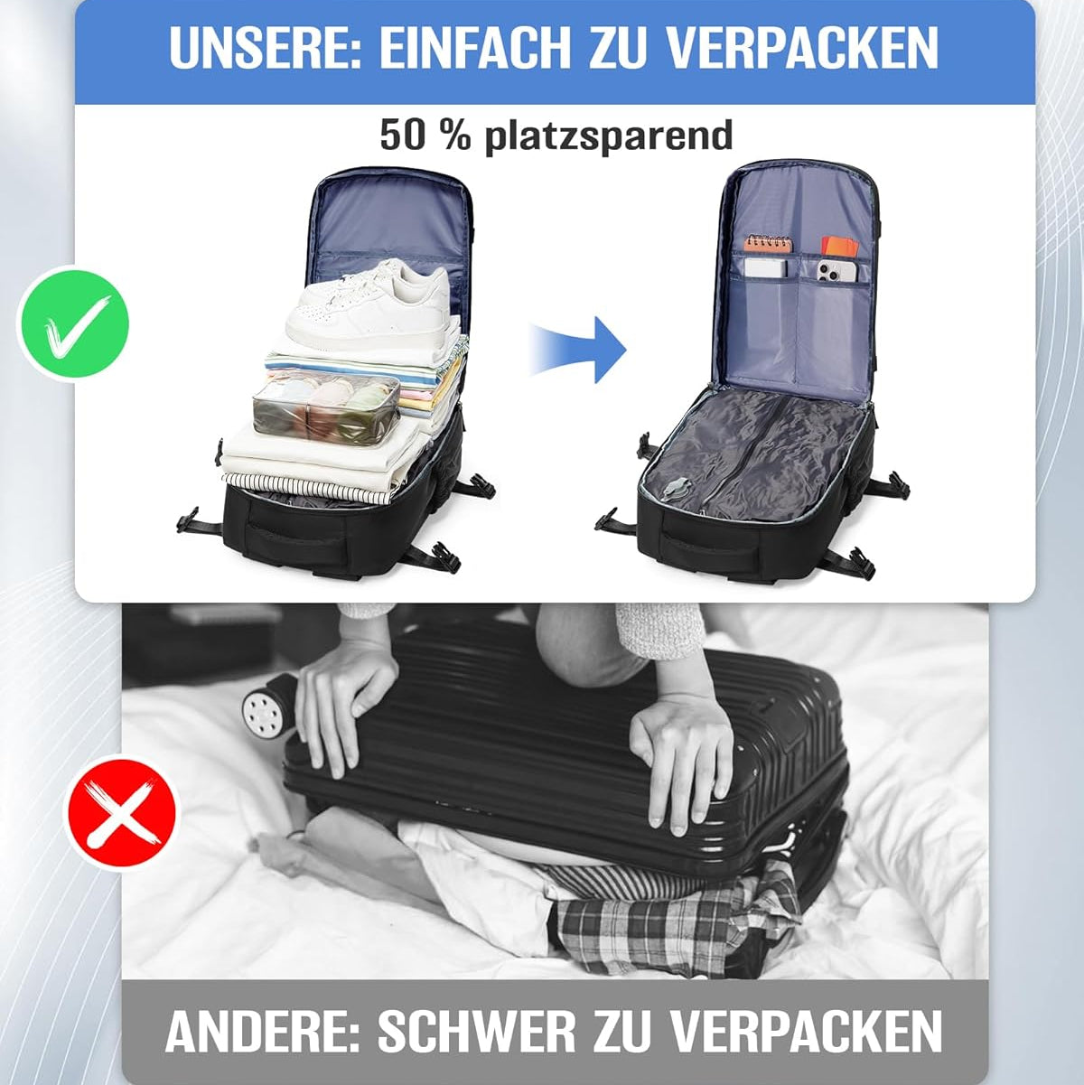 Früher musste ich immer entscheiden, was ich zuhause lasse. Jetzt passt alles rein und bleibt ordentlich komprimiert. Besonders auf Reisen ein absoluter Gamechanger. -